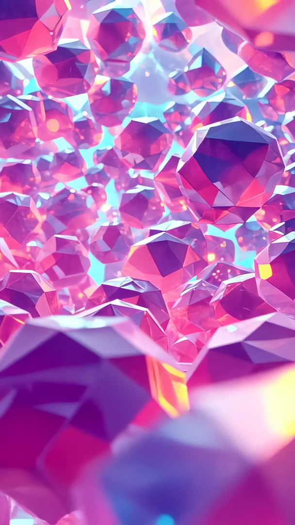 AI Generated Image. Vertical video showing camera pushing through dense field of faceted gems, revealing deep tunnel of pink and cyan crystals. Volumetric light scattering and layered parallax creating strong sense of depth while shallow depth of field producing soft bokeh highlights. Light reflecting off sharp facets producing sparkling glitter and warm color accents. Use cases: background for music visuals, social media reels, mobile ads, fashion and beauty promotions, jewelry product launches, title intros, event visuals, screen wallpapers. Editing tips: looping clip for seamless playback, adding slow zoom or subtle stabilization for pacing, applying color grade to match brand palette, overlaying minimal text in upper third to preserve tunnel focal area. Exporting in vertical formats for Instagram Reels, TikTok, Snapchat. Recommended for projects needing modern, luxurious, dreamy, futuristic look.