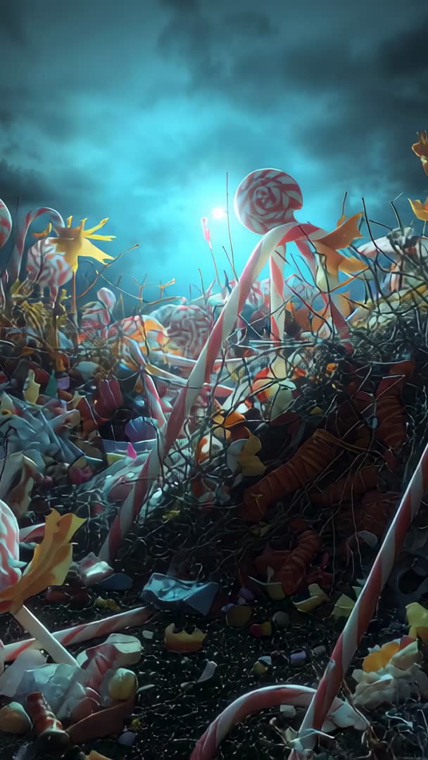 AI Generated Image. Pushing camera through dense tangle of wire-wrapped sweets under moody teal sky, revealing towering swirl lollipop and scattered broken candies. Showing layered textures, saturated colors, and cinematic backlight for dramatic visual contrast. Working well for social media reels, vertical ads, music video intros, title sequences, confectionery branding, packaging visuals, and holiday or festival promos. Serving as loopable background for Instagram Reels, TikTok, Snapchat and other mobile-first campaigns. Suggesting creative uses: overlaying bold type for product callouts, pairing with ambient electronic track for surreal mood, or cutting into montage for food art and fantasy projects. Providing high visual impact for designers, art directors, marketers, and content creators seeking whimsical yet slightly eerie confectionery aesthetics.