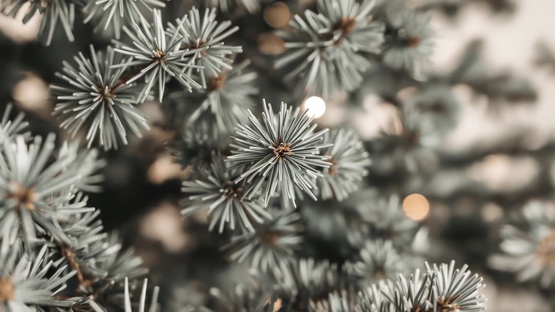 AI Generated Video. Camera pushing forward while sliding right, revealing radial clusters of silvery-blue conifer needles and small brown budlets. Macro closeup featuring shallow depth of field and warm bokeh highlights, creating soft neutral backdrop. Studio lighting accentuating needle texture and subtle color contrast. Clip working well as background for holiday marketing, Christmas greeting cards, seasonal website hero banners, social media reels, botanical or nature segments, and product overlays for ornaments or candles. Loop-friendly sequence offering gentle motion for calming desktop or mobile backgrounds, cinematic intros, or texture fills. Suitable for high-resolution edits, color grading, and creative cropping for vertical or square formats.