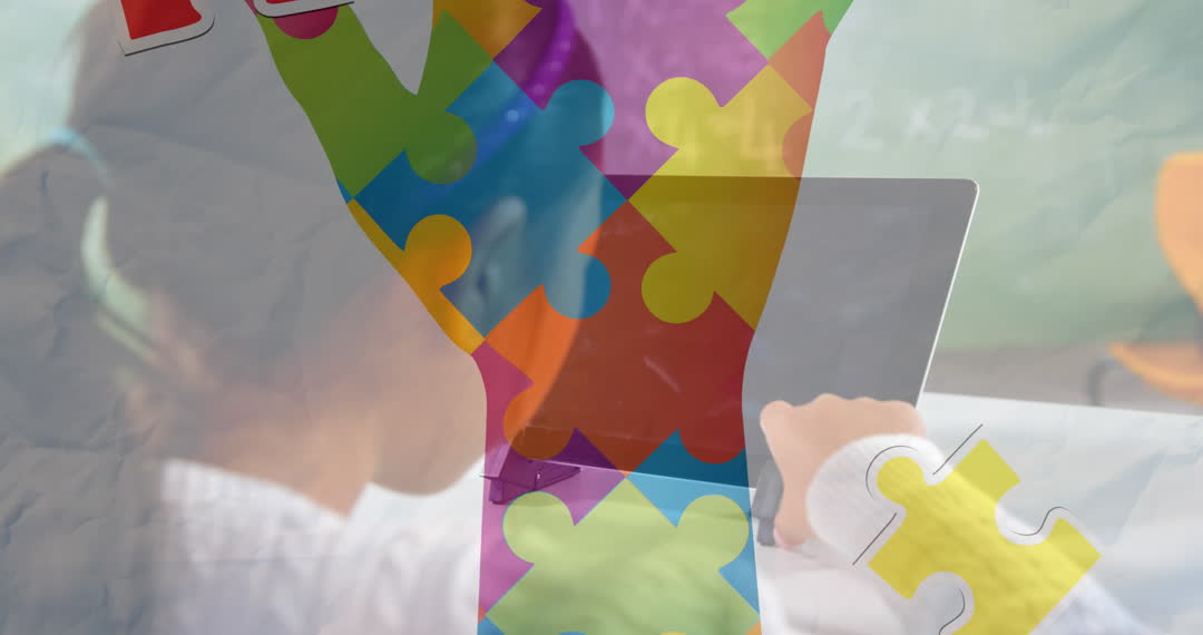 Colorful puzzle pieces overlay on video of girl using tablet symbolizes autism awareness and education. Useful for campaigns related to digital learning, inclusivity, and autism support. Ideal for promoting awareness months or educational technology propaganda.