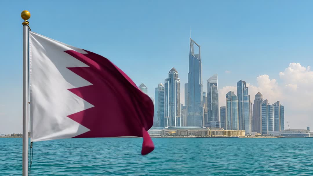 - Qatar Flag Waving at Sea with Doha Skyline Unfolding on Coastal Breeze