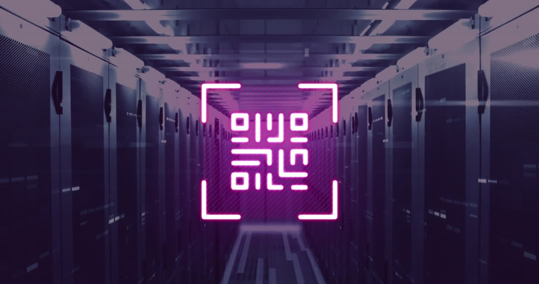 This visual depicts a futuristic server room with a digitally overlaid QR code in bright neon. Perfect for technology and finance-related themes, it illustrates the blend of digital networking and modern data solutions, making it ideal for use in presentations about innovation in IT infrastructure, internet security, or modern banking technology.