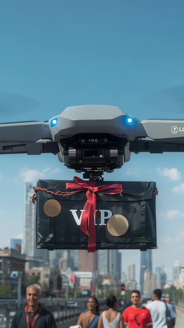 AI Generated Video. Showcasing quadcopter lowering VIP-branded package on red ribbon while hovering above busy waterfront promenade with high-rise skyline backdrop. Camera framing foreground gimbal and package descent with soft city bokeh and bright daytime sky creating modern urban tech mood. Suiting marketing campaigns for drone delivery startups, last-mile logistics presentations, e-commerce premium delivery ads, and technology news segments. Working well as vertical social media ad, website hero clip, investor pitch visual, corporate presentation opener, or broadcast segment illustrating urban mobility and contactless delivery. Editing suggestions: Using slow motion close-ups for dramatic reveal, adding animated map overlay for tracking effect, applying lower thirds for branding, pairing with upbeat electronic soundtrack, and retaining full vertical aspect for mobile-first platforms.