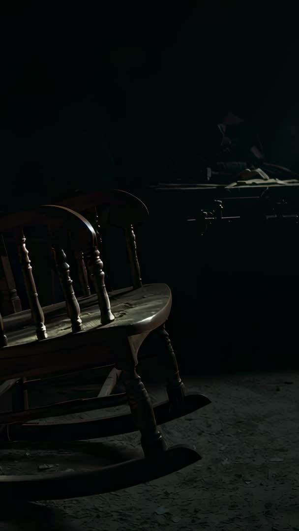 AI Generated Image. Vertical clip depicting vintage wooden rocking chair remaining still on dusty workshop floor under narrow beam of dim light. Composition highlighting worn wood grain, turned spindles, and deep shadow play for moody cinematic atmosphere. Scene evoking solitude, nostalgia, and time-worn craftsmanship while leaving ample dark negative space for on-screen titles or captions. Usage ideas: - Using as cinematic opener for heritage, restoration, or historical videos - Using as B-roll for documentary sequences about craftsmanship, rural life, or family heirlooms - Using as background visual for podcast episodes exploring memory, solitude, or aging - Using as promotional asset for antique furniture restoration, vintage shop, or interior design brand storytelling - Using as vertical social media content for Reels, Stories, or TikTok with slow ambient music Technical notes: - Vertical framing suited for mobile-first distribution - Low-key lighting inviting subtle color grading and soft film grain - Upper dark area offering clear space for logo, title, or captions