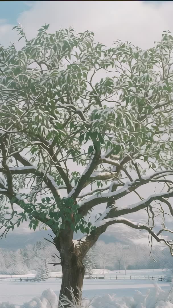 AI Generated Image. Video capturing quivering deciduous tree shedding delicate snowflakes across snow-covered field, with distant fence line and pine trees on horizon. Composition emphasizing tall vertical frame and sweeping branch silhouettes, creating strong negative space in upper area for overlay text or logo. Mood evoking solitude, calm, seasonal quiet, and slow winter rhythm. Ideal for use as background for social media reels, vertical ads, meditation apps, nature documentaries, seasonal promotions, calming B-roll, and outdoor lifestyle content. Footage lending itself to loopable clips, soft slow-motion edits, ambient sound design, and gentle color grading to shift mood between warm golden tones or cold blue tones.
