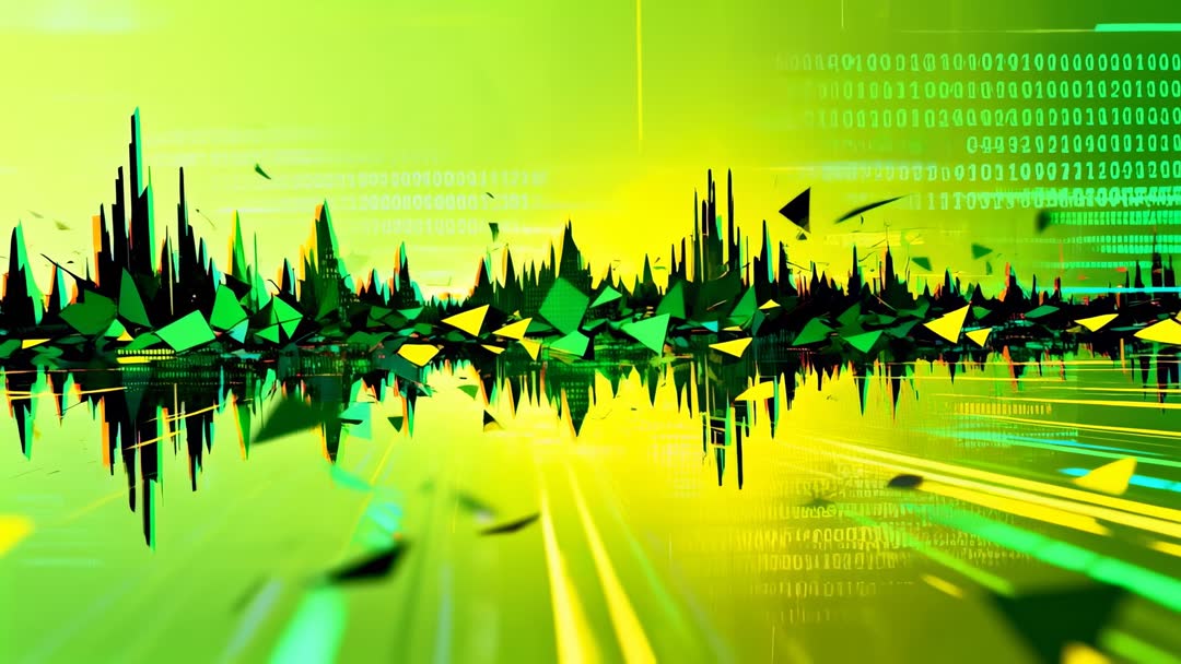 AI Generated Video. High-energy video clip showing camera racing through neon green and yellow polygonal cityscape reflected on glossy surface. Binary code and triangular fragments floating across frame, creating sense of data flow and high-speed transit. Strong color contrast and deep reflections lending cinematic cyber-futuristic mood. Serving as dynamic backdrop for technology, AI, big data, fintech, cybersecurity, sci-fi projects. Working well for website hero banners, conference openers, motion graphics, social media promos, presentation slides, or product demos. Allowing easy text and logo overlay due to central skyline silhouette and clean lower reflection area. Suitable for looped playback and seamless transitions in video editing.
