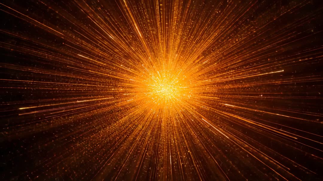 AI Generated Image. Video showing bright orange core at center emitting long radial streaks of light and shimmering particles across dark background. Motion suggesting rapid expansion and depth, with streaks and sparkling dust creating cinematic sense of speed. Warm amber and gold palette creating dramatic contrast against near-black space. Visual characteristics: high-contrast, radial motion blur, subtle grain, loop-friendly composition centered on luminous core. Usage ideas: using as title intro for film or game, placing behind typography for hero banner, pairing with electronic music for visualizer, using in sci-fi trailers or tech promos, applying as backdrop for event visuals or stage projection, incorporating into presentation slides about energy, space, or innovation. Production tips: recommend looping clip, applying speed ramping, adding bass-driven sound design, color grading to match brand palette, using blend modes like screen or add when layering, masking center for text overlay, combining with lens flares or particles for extra depth.