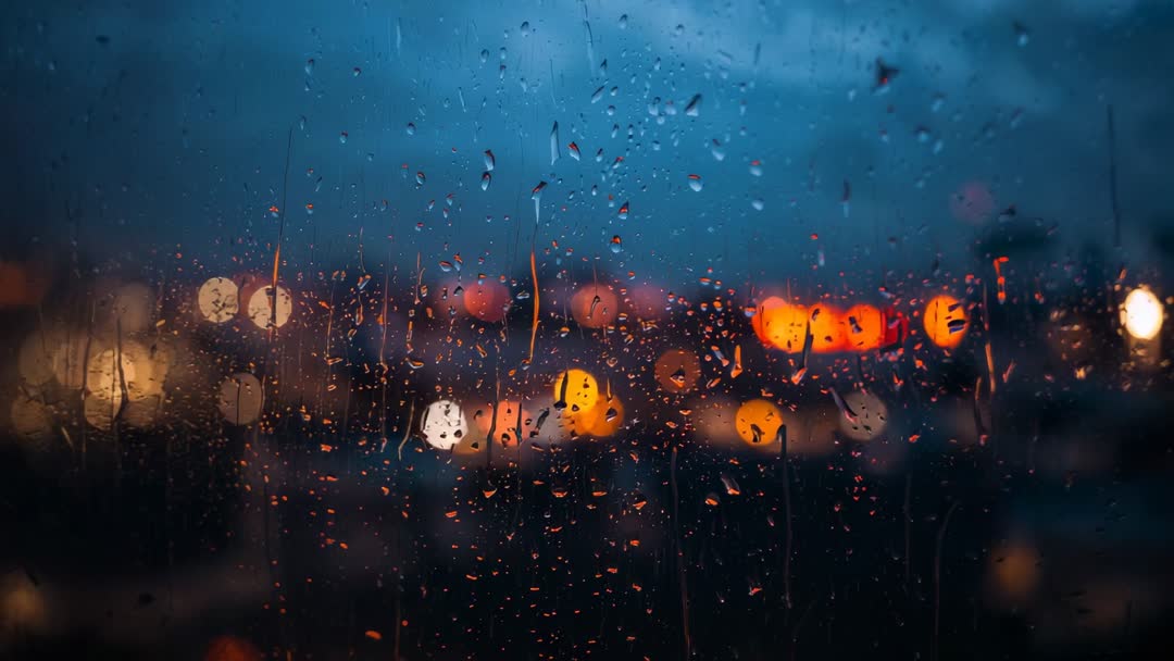 - Rain Sliding Down Window at Dusk with City Bokeh Lights and Moody Evening Glow