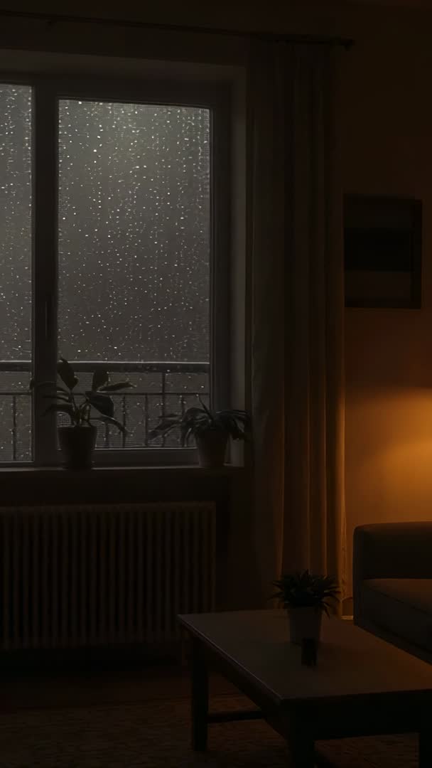 AI Generated Video. Showing rain droplets sliding down wet glass while warm amber lamp glow casting cozy light across living room corner. Featuring potted plants on windowsill, curtain, radiator, balcony railing and soft coffee table in foreground. Creating moody, calming atmosphere for use in social media stories, mobile reels, meditation and sleep apps, background loops for music videos, website hero banners, and advertising for home decor or lighting products. Vertical video orientation optimized for mobile viewing and easy looping. Suggesting color grading toward warm tones and adding gentle rain audio for immersive ambient playlists or relaxation content.