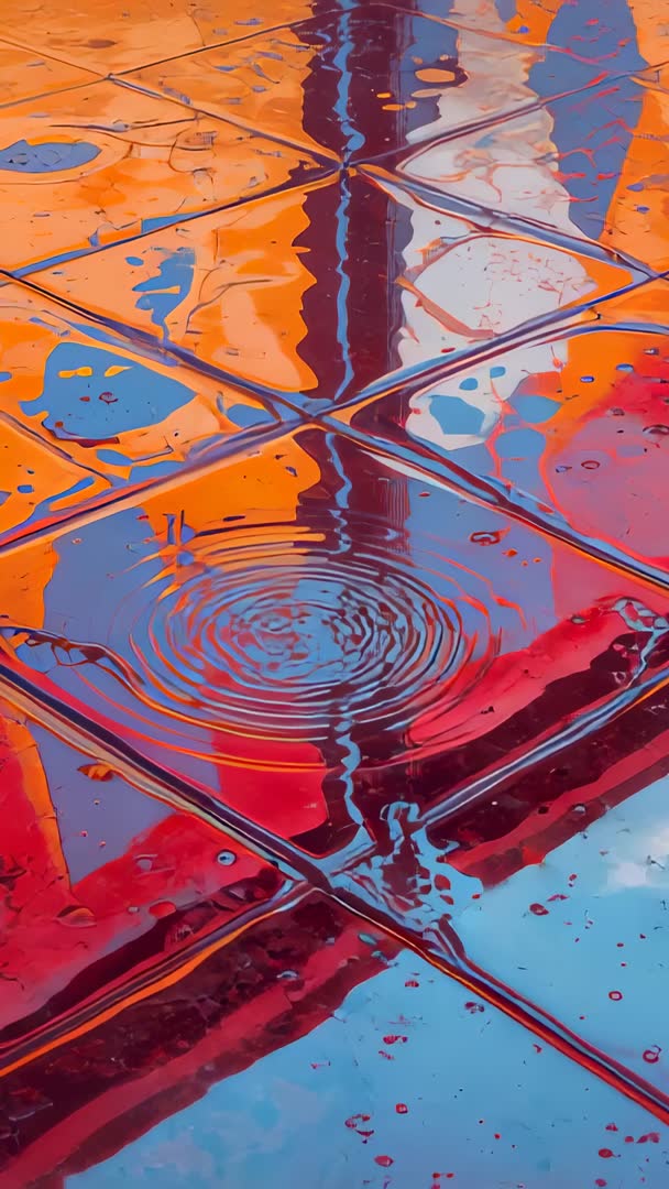 AI Generated Image. Vertical 9:16 video showing raindrop rippling shallow puddle across glossy glazed tiles with visible grout lines. Bright orange, red, blue reflections creating abstract mosaic across tile grid. Concentric rings radiating from impact point while small droplets splashing and surface tension warping reflections. Composition emphasizing texture, color contrast, and geometric grout lines, ideal for close-up motion loop. Use cases including website hero backgrounds, social media stories, vertical ads, music video overlays, meditation or mindfulness app visuals, interior design mood reels. Editing suggestions: loop clip for seamless background, apply slow-motion for dramatic ripple detail, overlay text or logo on darker bands, adjust color grading to match brand palette, combine with ambient sound or soft percussion for immersive effect.