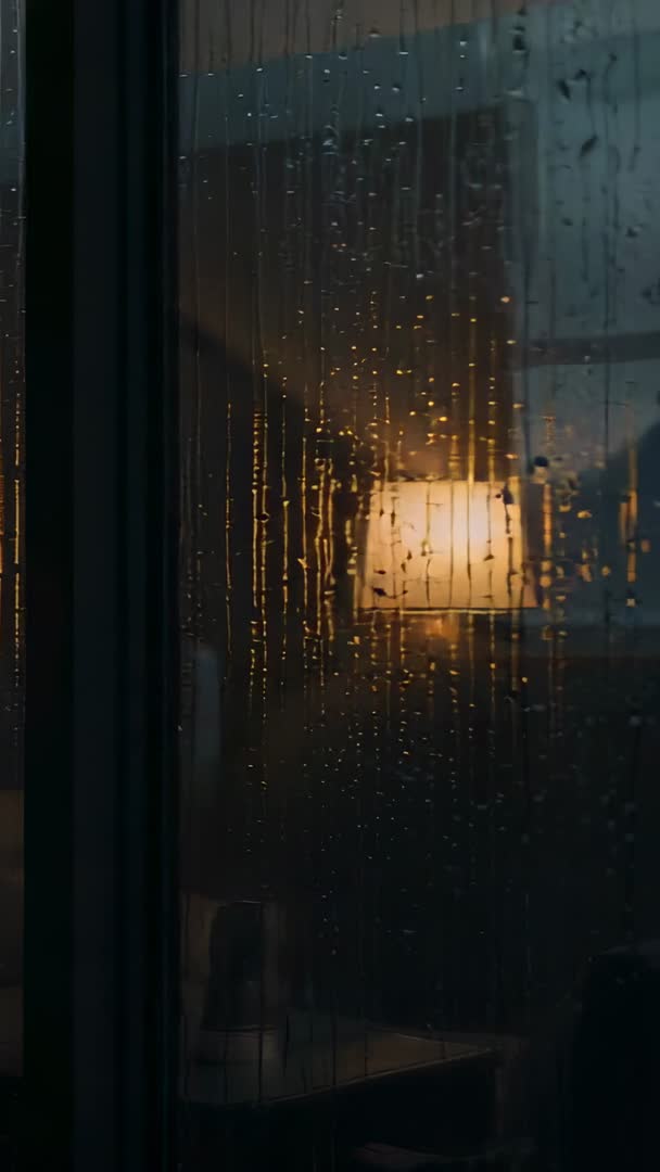 AI Generated Video. Showing raindrops streaming down window glass and forming vertical rivulets that distort warm lamp glow at twilight. Creating close-up streak patterns and soft bokeh from lamp behind glass, evoking quiet evening and intimate indoor atmosphere. Working well for background footage in film scenes, title sequences, romantic montages, wellness and meditation content, and weather or mood-driven storytelling. Optimizing for vertical mobile formats, social media reels, app headers, ambient loops, and website hero sections using gentle slow motion and subtle sound design. Suggesting color grading to deepen blues and boost warm highlights for cinematic contrast. Licensing ideas include hospitality promos, interior design showcases, music video overlays, commercial spots, and mood-setting interstitials. Ideal for layering with gentle piano or lo-fi soundtrack, slow crossfade transitions, and text overlay for headline or logo.