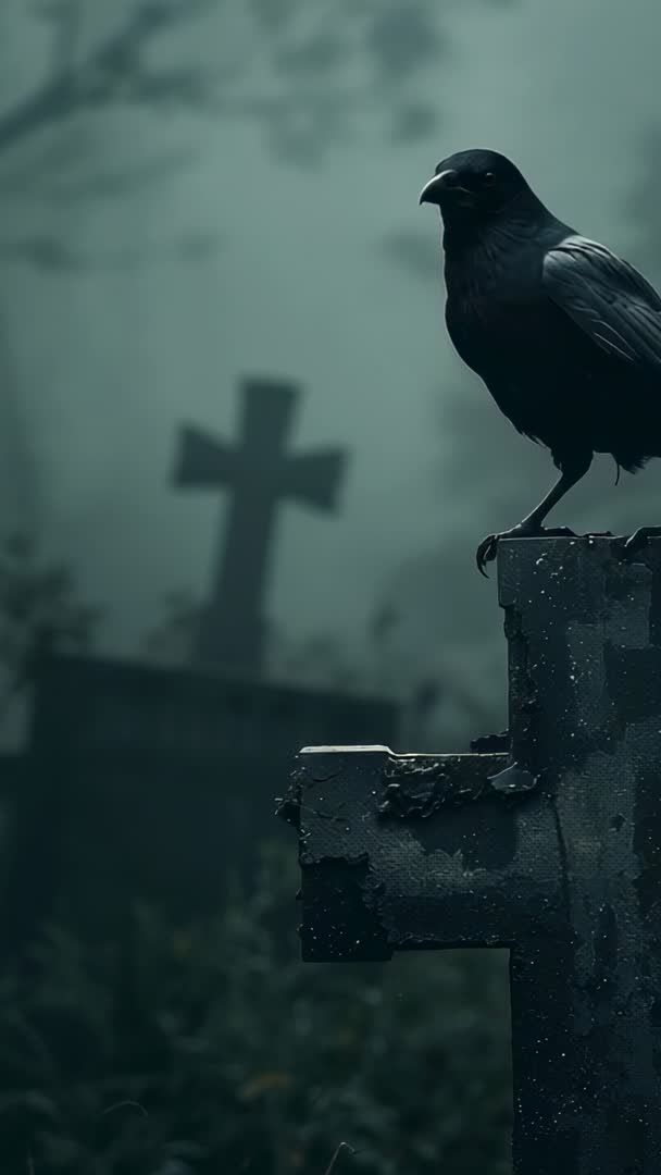 AI Generated Video. Raven perching on weathered stone cross, fog drifting through old graveyard, silhouette contrasting against desaturated sky. Vertical cinematic clip capturing close-up of raven facing lens, slow camera movement adding suspense and tension. High-contrast cool desaturated toning creating eerie gothic atmosphere suited for horror and mystery themes. Enhancing Halloween trailers, book covers, podcast intros, social media reels, atmospheric backgrounds for film title sequences, haunted attraction promos, editorial features about folklore or cemetery history. Optimizing mood by applying teal-green color grade, subtle vignettes, and layered ambient sound design with distant wind and crow calls. Providing ample copy space in out-of-focus left area for titles, logos, or lower-third graphics.