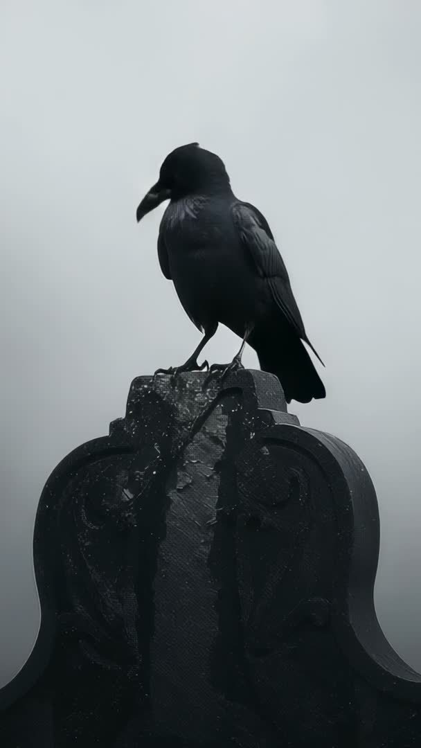 AI Generated Image. Perching raven captured as vertical video, standing on weathered headstone against foggy desaturated sky. Pecking at stone then launching into misty air, creating dramatic silhouette and sudden motion. Ample negative space above head offering clean area for headline, title, or captions for social reels and vertical ads. Perfect for Halloween promotion, gothic book cover, cemetery documentary opener, memorial article, or moody nature piece. Editing suggestions: adding slow-motion cut on takeoff, desaturating colors, boosting contrast on bird silhouette, applying subtle film grain, layering ambient wind or distant caw sound. Delivering eerie, contemplative mood suitable for storytelling, atmospheric background, or promotional campaign.