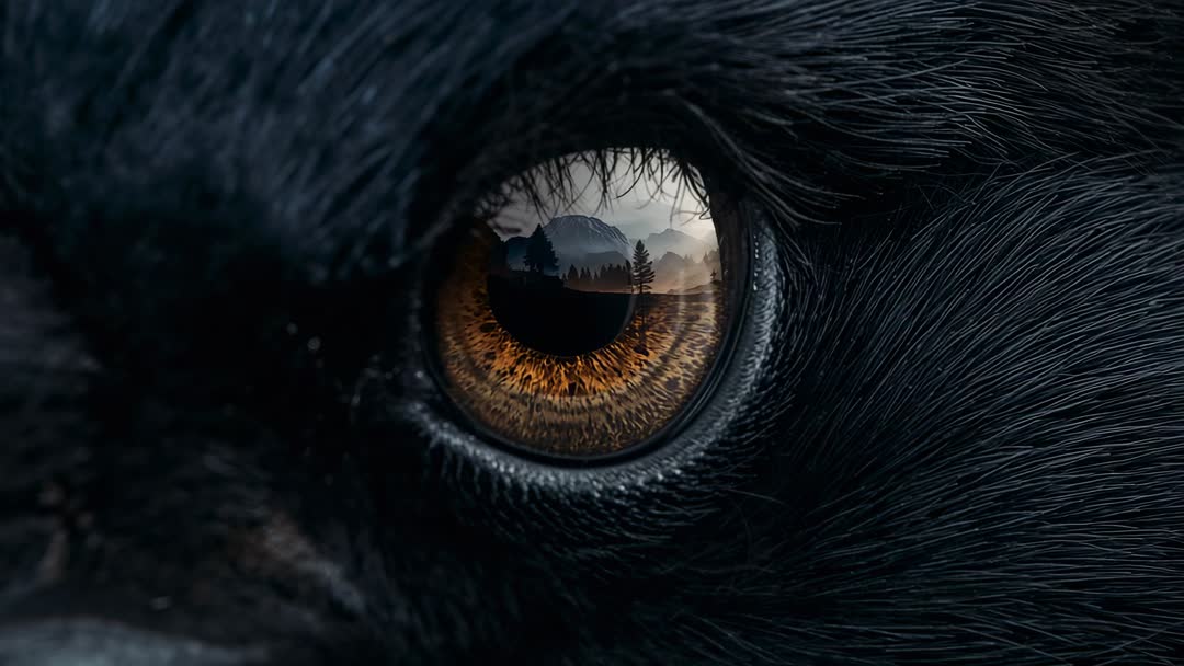 AI Generated Video. Compelling depiction of a raven's eye reflecting a scenic mountain landscape. Ideal for depicting themes of wildlife observation, connection between nature and wildlife, or as part of artistic expressions showcasing the complexity and beauty of nature. Suitable for use in educational materials, illustrative services seeking symbolism of insight or reflection, and advertising aimed at ecological conservation.