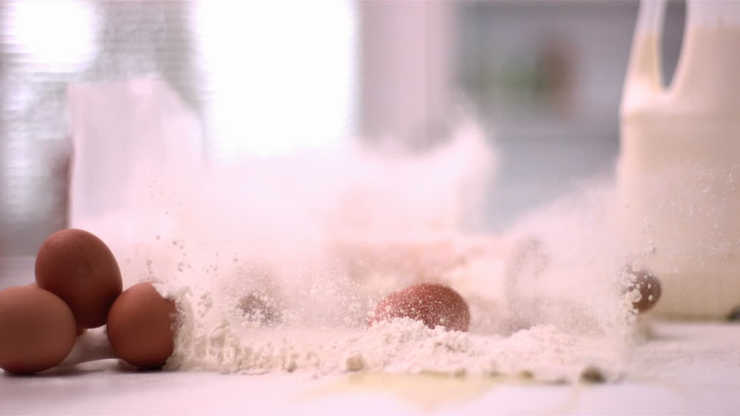 - Raw Egg Cracking in Flour in Slow Motion Kitchen Scene