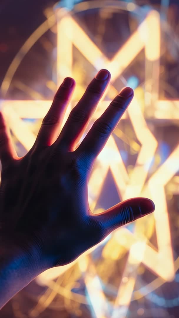 AI Generated Video. Vertical cinematic footage showing adult hand reaching and rotating near glowing neon star reflection. Closeup capturing fingers and palm silhouette against warm bokeh, mixing blue and amber tones. Suiting mobile-first projects, social media Reels, TikTok intros, vertical ads, app splash screens. Working well as looped background, visual transition, title opener, overlay for product reveal or mood reel. Useful for adding moody futuristic vibe to music videos, tech promos, nightlife content, holiday visuals, spiritual or introspective themes. Editing suggestions: applying slow zoom, color grading to enhance contrast, adding subtle sound design for immersive effect, pairing with ambient electronic track for emotional impact.