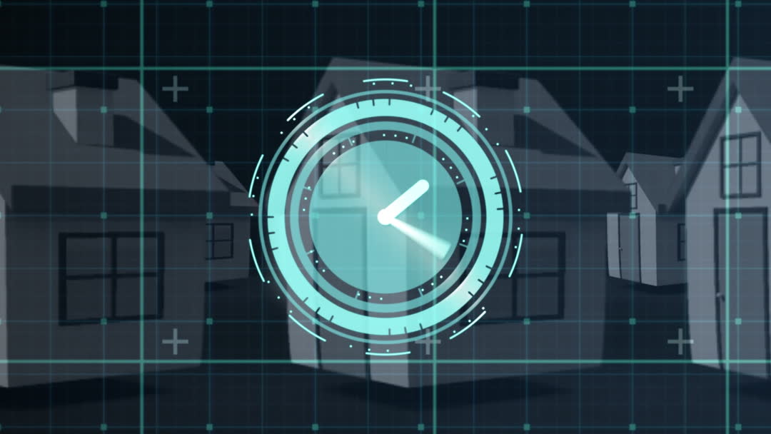 This visual represents the intersection of time management and real estate development. Featuring a digital clock animation overlaid on house structures, it symbolizes the importance of timing in project planning and architecture. Ideal for use in presentations about urban planning, construction timelines, or time-sensitive real estate strategies, and for creating engaging content for digital media platforms related to real estate tech innovations.