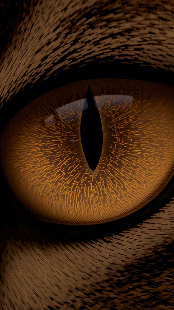 AI Generated Video. Vertical macro video showing receding camera revealing feline eye pupil widening into slit amber iris with glowing radial texture and reflective glint. Slow camera movement and dramatic low-key lighting creating cinematic, suspenseful mood. Ideal for use in wildlife documentary intros, thriller or horror title sequences, pet care or veterinary education, advertising for cat products, or social media short-form content. Clip works well for looping background, overlaying bold text, adding subtle sound design for tension, or combining with slow zoom and color grade for cinematic finish. High-detail iris texture providing striking close-up for educational visuals, branding, or creative motion graphics.