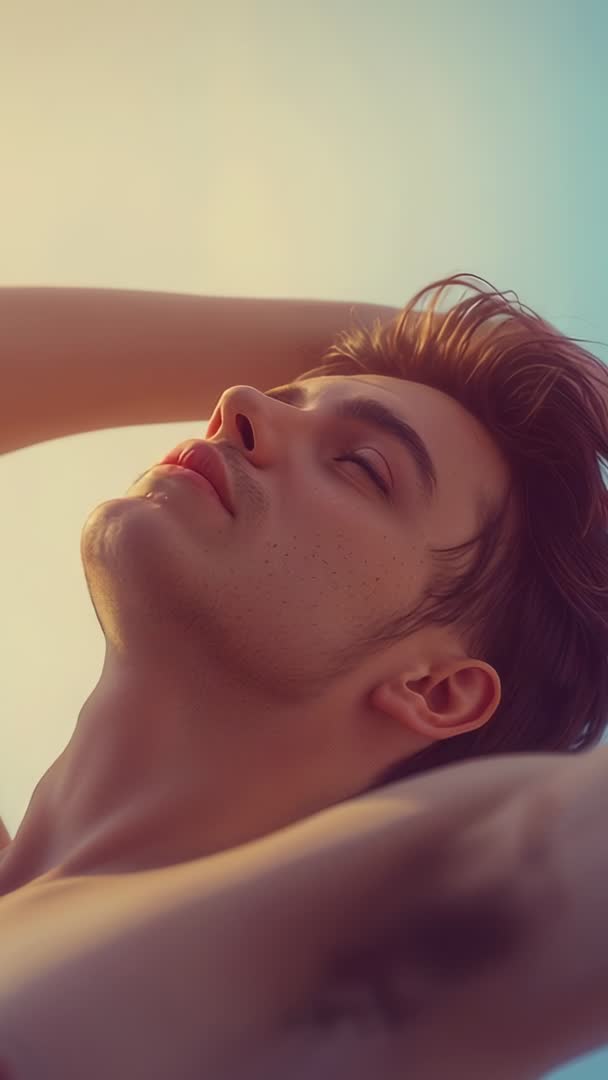 AI Generated Image. Video showing closeup portrait of young man reclining with arms behind head, shirtless, gazing upward while soft warm light and pastel gradient background creating calm, cinematic mood. Camera focusing on skin texture, jawline, and hair movement, offering intimate, editorial feel. Useful for beauty, grooming, skincare, fashion, wellness, lifestyle, dating app, social media, hero banner, ad campaign, mood film, brand storytelling. Video working well for vertical-first platforms such as Instagram Reels, TikTok, mobile ads, and product pages. Color grading and soft contrast leaving space for text overlay and logo placement at top and bottom. Editors applying slow-motion, subtle zoom, or soundtrack to enhance emotive vibe. Licensing options including commercial, editorial, and advertising.