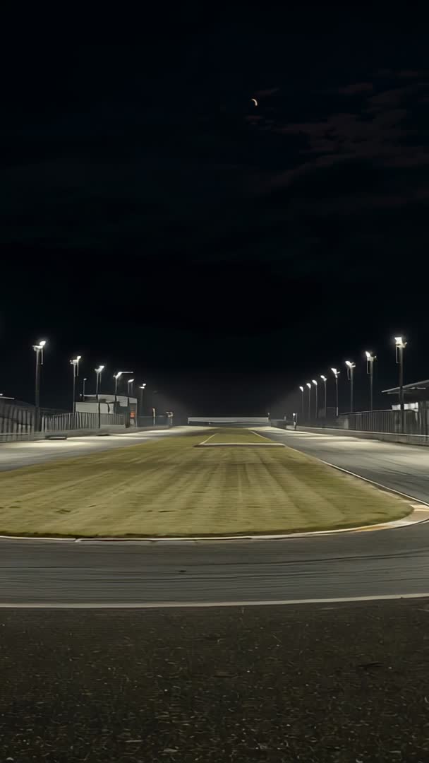 AI Generated Image. Vertical video recording showing illuminated motorsport track under floodlights at night, with grass infield and empty pit lane. Low vantage point and symmetrical composition creating strong leading lines toward distant finish straight. Crescent moon appearing above dark sky adding moody atmosphere. Footage suiting motorsport promos, race weekend social reels, vertical ads, broadcast openers, and venue lighting tests. Editors using footage for title sequences, countdown overlays, slow motion stings, or background plates for driver interviews. Color grading suggestions include low-key cinematic look with cool highlights and warm grass tones to enhance contrast. Camera guidance recommending wide aperture and moderate shutter speed for crisp track detail while preserving ambient glow.