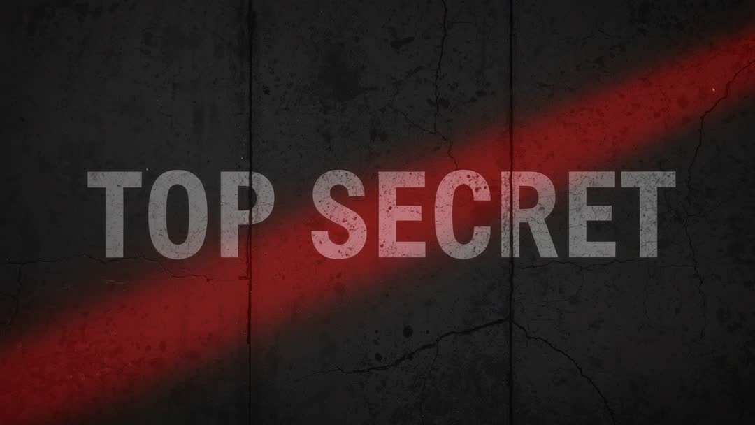 AI Generated Image. Clip showing red beam sweeping diagonally across TOP SECRET stencil on cracked concrete wall, producing pulsing flicker and gritty noir atmosphere. Stencil letters appearing weathered and worn, creating tension and vintage classified mood. Suitable for thriller opener, cybersecurity or data breach segment, documentary on secrecy, title card for podcast or video series, marketing for security products, poster and social media teaser. Looping playback and holding final frame enhancing dramatic pause. Adding subtle film grain, low-key ambient soundtrack, cinematic color grade and animated title overlay for polished finish. Providing high-contrast text overlays and lower thirds for news graphics. Offering wide aspect ratio and strong negative space for headline copy or logo placement.