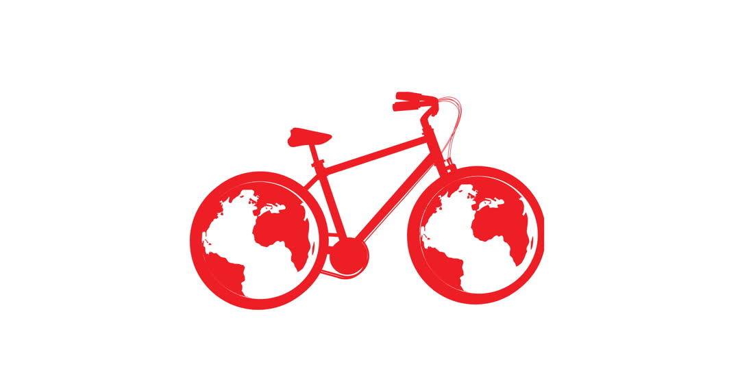 Illustration of a red bicycle featuring wheels represented as globes implies environmentally-conscious transportation. Ideal for promoting eco-awareness, sustainable travel, or green living initiatives. Suitable for educational content, environmental campaigns, or travel websites focused on reducing carbon footprint.
