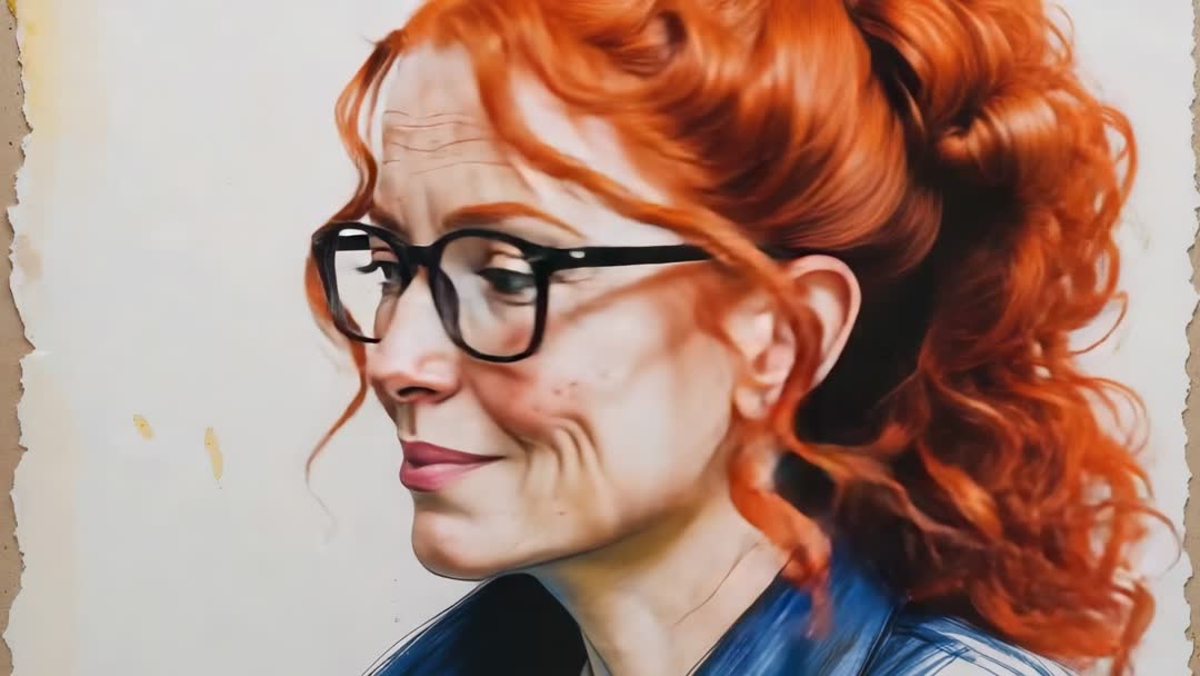 AI Generated Image. A woman with bright red hair expertly styled is shown turning her head in profile view. She wears contemporary-style glasses, highlighting a minimalist yet sophisticated look. This setting in a neutral space contributes a focus on her elegance. Ideal for editorial use, style guides, wellness campaigns, or content related to eyewatch fashion.