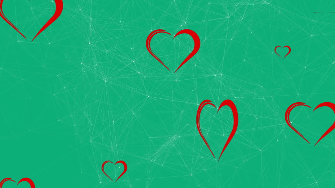 This video features red heart icons over a green background filled with digital connections and lines, symbolizing a mix of emotion and technology. Perfect for use in Valentine's Day themes, digital communication materials, and presentations on global connectivity in modern relationships.