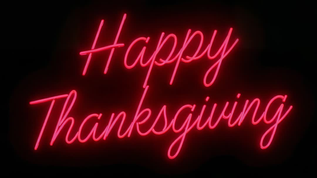 - Red Neon Happy Thanksgiving Sign Pulsing with Halo Glow and Flicker on Black Background