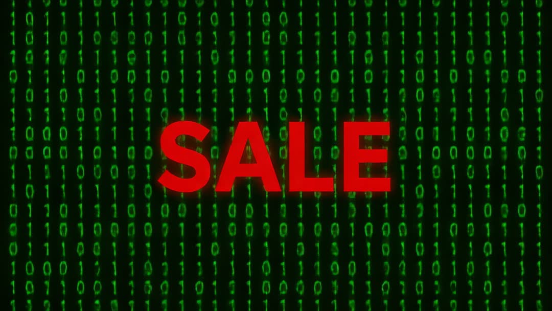 AI Generated Image. Displaying bold red SALE text centered over vertical scrolling green binary digits, creating neon cyber aesthetic and high contrast urgency. Clip is looping and cinematic, combining tech vibe with retail message for strong visual impact. Ideal for cyber Monday campaigns, flash sale promos, online storefront banners, social media ads, email headers, website hero video, in-store digital signage, livestream overlays, and trade show screens. Allowing easy customization of text, color, speed, and logo overlay; supporting insertion of countdown timer, sound effects, or animated transitions. Targeting retail brands, ecommerce platforms, tech companies, gaming retailers, and cybersecurity firms looking for modern promotional visuals. Using as background for animated banners, pre-roll ads, product launch teasers, and promotional stories.