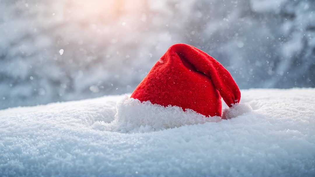 AI Generated Video. Clip showing red Santa hat nestling in fresh snow, soft snowflakes falling, warm sun flare glowing in distant background, shallow depth of field creating soft bokeh and serene winter mood. Vivid red hat contrasting with cool blue snow, crisp snow texture and plush white trim adding tactile appeal. Perfect for holiday marketing, seasonal social media posts, greeting card animations, website hero banners, TV commercial openers, retail window displays, event promotions, festive transitions. Useful as looping background, product overlay, title intro, postcard animation, email header, countdown sequence. Editing tips: crop for landscape or square formats, add vintage filter for nostalgic mood, apply slow motion or crossfade for gentle motion, overlay holiday text and logo. Licensing note: generic prop footage not depicting recognizable people, suitable for commercial use, verify local licensing rules.