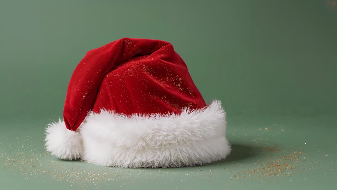 AI Generated Video. Frame from slow cinematic clip showing red velvet Santa hat sitting on green tabletop while gold glitter scattering around. Soft studio lighting highlighting plush white fur trim and velvet texture, creating warm festive mood. Ideal for holiday marketing, ecommerce product showcasing, seasonal social media posting, greeting card animating, banner video producing, YouTube intro creating, website hero header designing, retail signage displaying, packaging mockup presenting. Placing text overlay on right allowing headline and call-to-action. Looping short clip working well for Instagram Reels, TikTok, Facebook ads and digital signage. Color grading suggestions: boosting warmth, increasing contrast slightly, adding subtle vignette and soft grain for vintage feel. Providing plenty of negative space on left for copy and logos. Suitable for holiday campaign themes, gift guides, seasonal email headers, store displays and online ads.