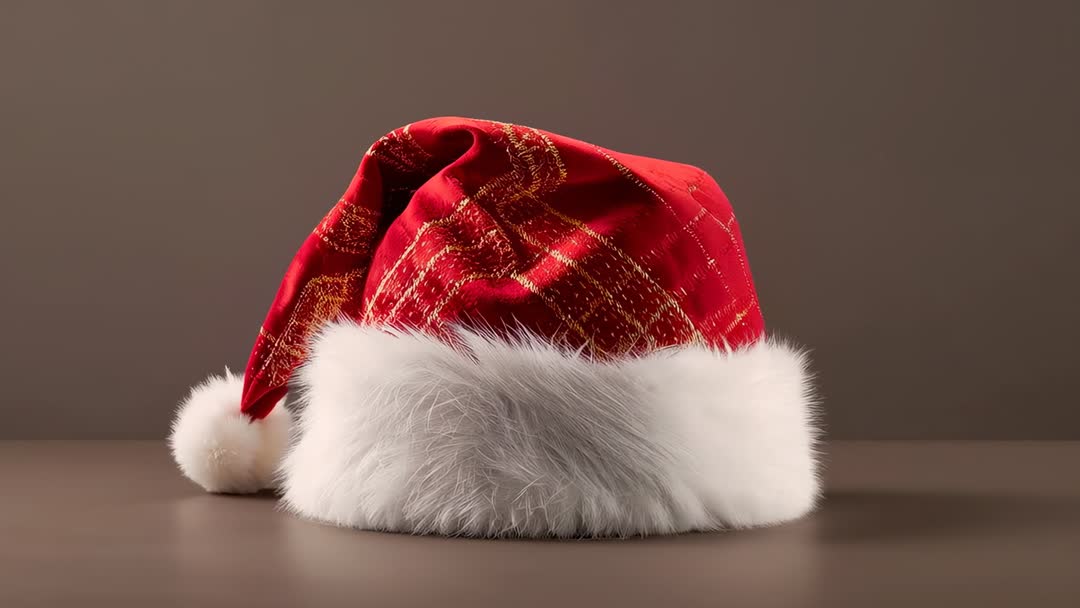 AI Generated Image. Looping short clip showing red Santa hat rotating slowly on studio table, white fur brim and pompom fluffing against warm brown backdrop. Close-up framing highlighting rich velvet texture and gold stitching catching soft studio light, creating cozy festive mood. Ideal for holiday marketing, e-commerce product pages, social media reels, greeting card animations, retail signage, and seasonal website headers. Working well as looping hero background, product demo clip, or overlay for promotional text and logos. Suitable for holiday ads, seasonal emails, packaging mockups, and motion design projects requiring tactile texture and soft motion. Supplied in high-resolution video frame, compatible with 4K editing workflows and slow-motion extraction.