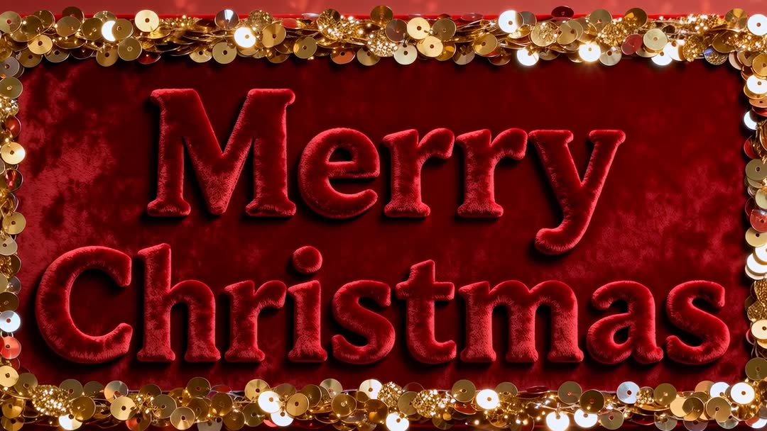 AI Generated Video. Camera zooming across red velvet Merry Christmas sign edged with gold sequin garland while studio lights shifting to create sparkling highlights and deep plush shadows. Velvet letters showing rich texture and three-dimensional depth, sequin trim reflecting warm golden light and producing soft bokeh along frame. Composition offering cinematic, festive mood and tactile luxury. Using for holiday video intros, social media reels, seasonal email headers, retail display loops, e-card animations, gift shop signage, event promos, and product showcase backdrops. Working well for luxury brand campaigns, restaurant or hotel holiday promotions, online storefront banners, and decorative tutorial clips. Editing-friendly composition leaving negative space for overlay text, logos, and lower-third graphics. File delivering warm, opulent holiday vibe with modern glam.