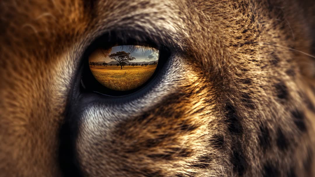 AI Generated Video. Close-up view of a cheetah’s eye with the African savannah scene, including an acacia tree and animals, reflecting in its pupil. The reflection adds depth, illustrating wildlife's keen observation and focus. Useful for projects on wildlife conservation, hunting intuition, or exploring predator-prey dynamics in nature documentaries, or educational content about animal behavior and habitats.