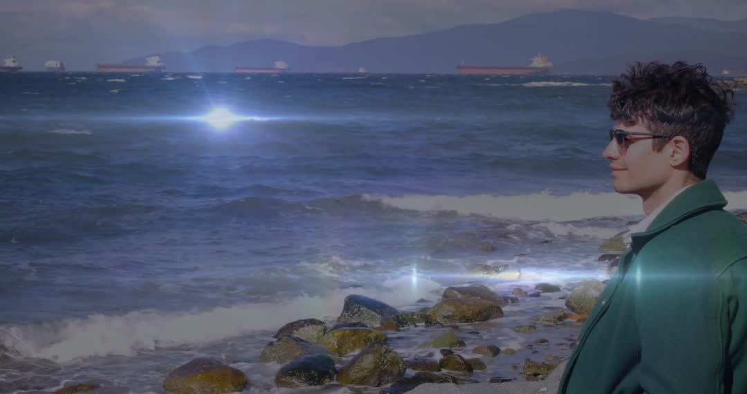 A man wearing green coat and sunglasses stands thoughtfully near a rocky shore with waves crashing in the background. Ships are visible along the horizon, and cinematic lens flares add a dramatic effect. Suitable for promoting introspection, environmental awareness, and personal journeys.