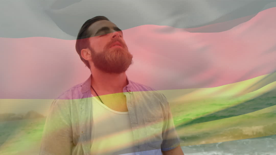 This visual combines elements of reflective consciousness and national pride, with a man at the seaside featuring an overlay of the German flag. Useful for concepts related to patriotism, cultural identity, travel promotions, or inspiring vacations.
