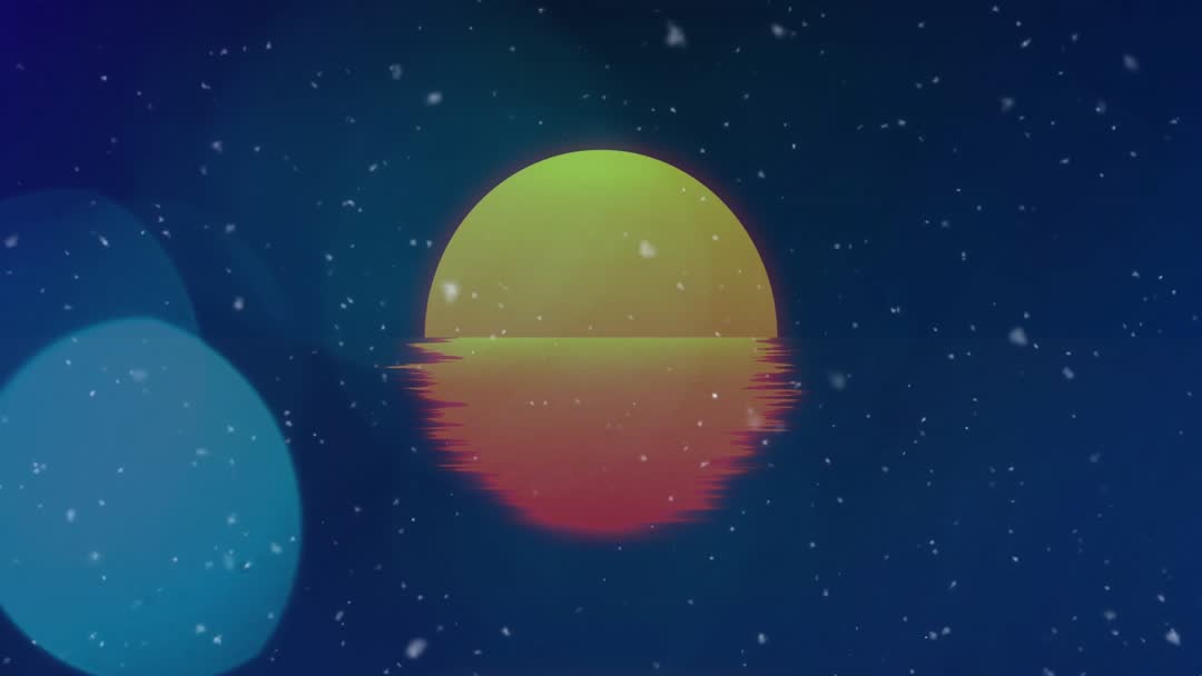 A glowing sunset partially hides behind the water surface surrounded by bokeh lights and sparkling stars. This scene creates an ambient feel, emphasizing elegance and serenity in a setting mingling artistry with nature's beauty. Ideal for use in designs focusing on meditation, music backgrounds, relaxation content, or creative projects needing a modern atmospheric depiction.