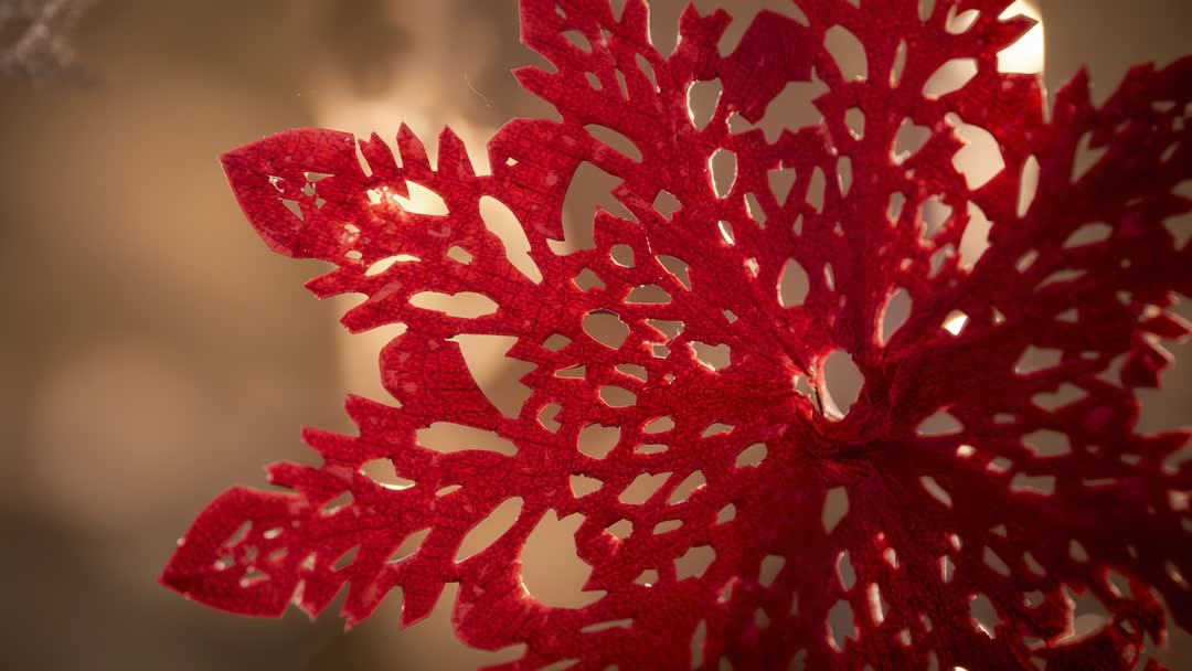 AI Generated Image. Video clip showing camera refocusing on red papercut lace ornament, foreground moving into sharp focus while warm bokeh lights glowing in background. Intricate cutwork and fibrous texture appearing under soft backlight, thread details catching highlights. Visual mood feeling cozy and festive with deep crimson tones and golden blur. Suited for holiday greeting backgrounds, seasonal social media banners, craft blog headers, and product promo clips. Works well as looping close-up for motion graphics, overlaying text for event invitations, or cropping for square and vertical formats. Useful for designers seeking textured abstract background, DIY tutorial intros, print greeting cards, website hero panels, and mood board imagery. Technical notes: shoot sourced from macro video clip, offering tight detail and shallow depth of field for selective focus edits and color grading.