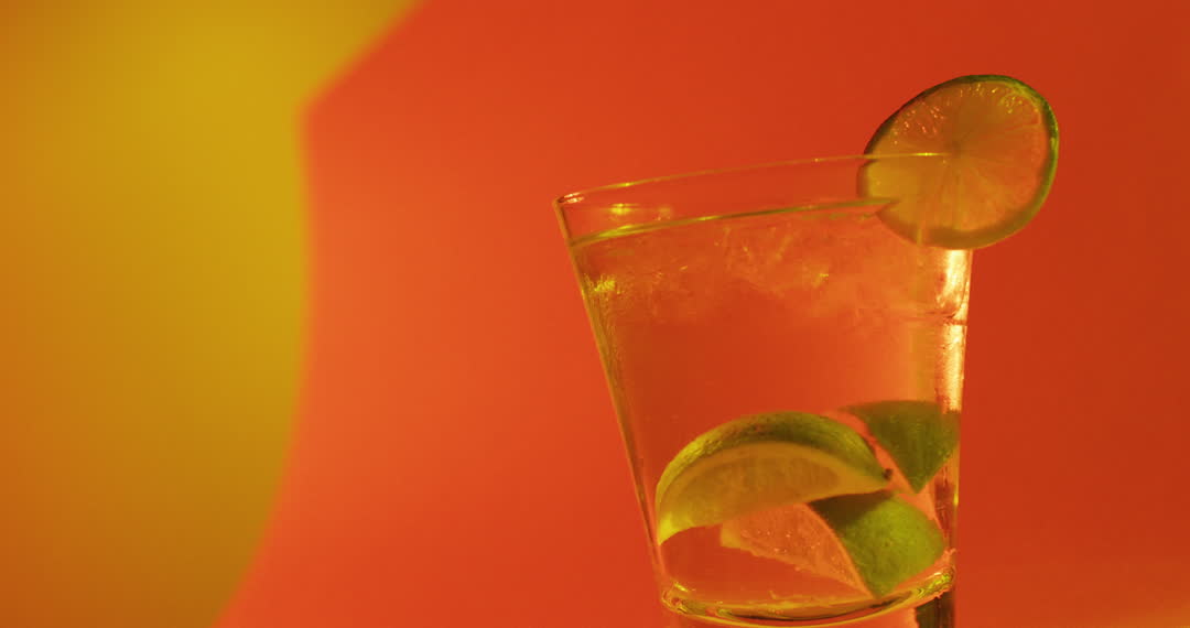 Close-up view of a sparkling cocktail garnished with a lime slice set against a bright orange background. This vibrant setting enhances the drink's appeal, making it ideal for themes centered around summer parties, celebratory events, and refreshment promotions.
