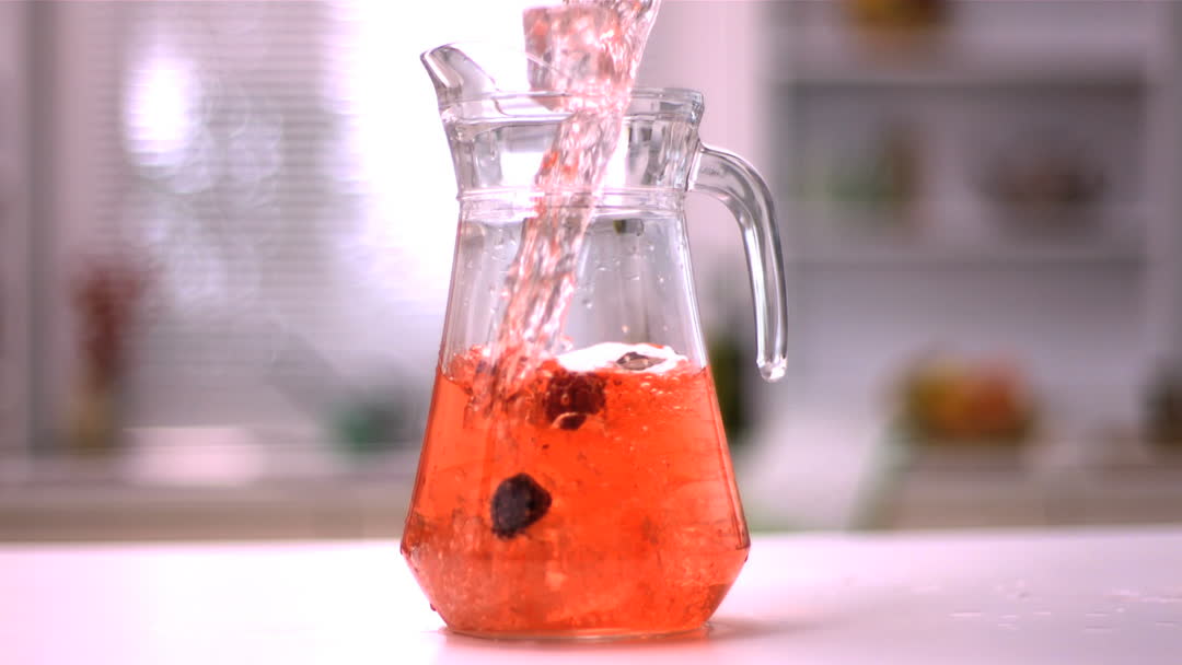 Liquid being poured into a clear jug with red juice and floating berries in a kitchen environment. Perfect for use in beverage promotions, healthy living content, or culinary blogs.