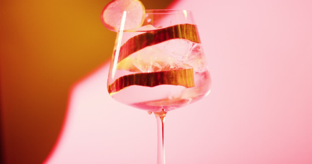 This vibrant video showcases a cocktail glass filled with ice, topped with fresh lemon and occupy space against a colorful abstract background. The lively colors create a tropical aesthetic which makes it perfect for advertising party events, bar offers, or summer promotions. Ideal for use in cocktail recipe books, hospitality material, or restaurant websites spotlighting sophisticated drink options.