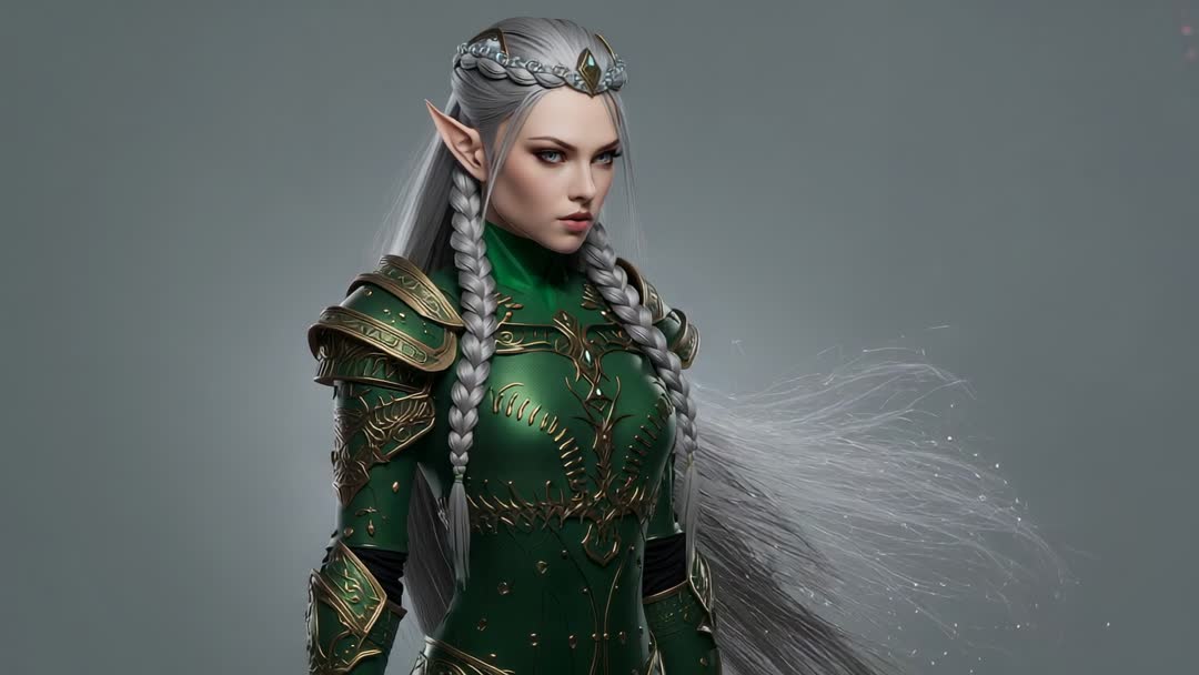 AI Generated Image. AI-generated fantasy video of a mystical elf warrior is showcasing a majestic presence with detailed green armor and braided hair, rotating from front to profile view. Suitable for use in graphic design, storytelling introductions for fantasy genres, gaming character inspiration, or art appreciation settings.
