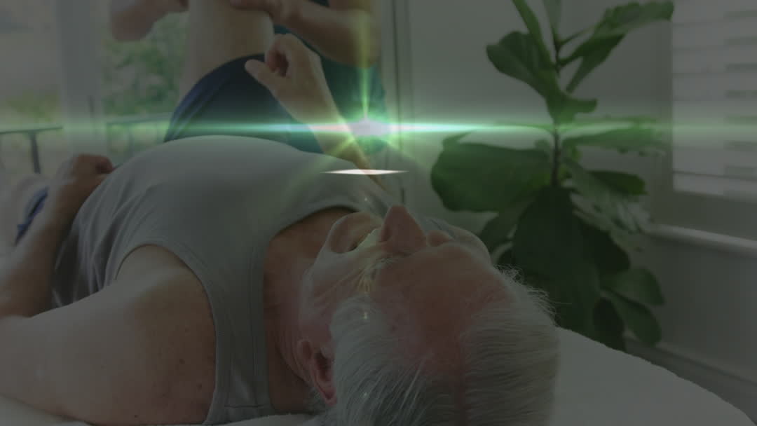 Elderly patient lying on a table during rehabilitation session with a therapist providing physical therapy. Soft green light effects and digital overlays create a futuristic vibe, reflecting innovations in healthcare. Ideal for illustrating advances in medical treatment and integrating technology with patient care. Valuable for medical and health tech presentations, care home brochures, and wellness campaign materials.