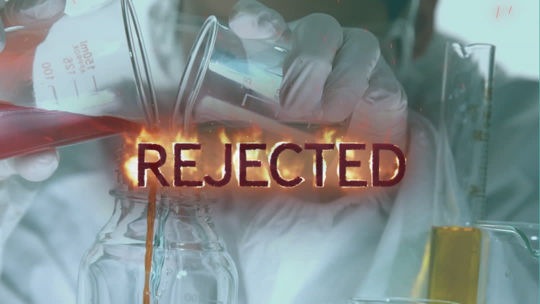 Laboratory scene showing a simmering process highlighted with a rejected stamp. Ideal for conveying failed experiment scenarios, scientific research challenges, and academic presentations on ethics in scientific methodology.