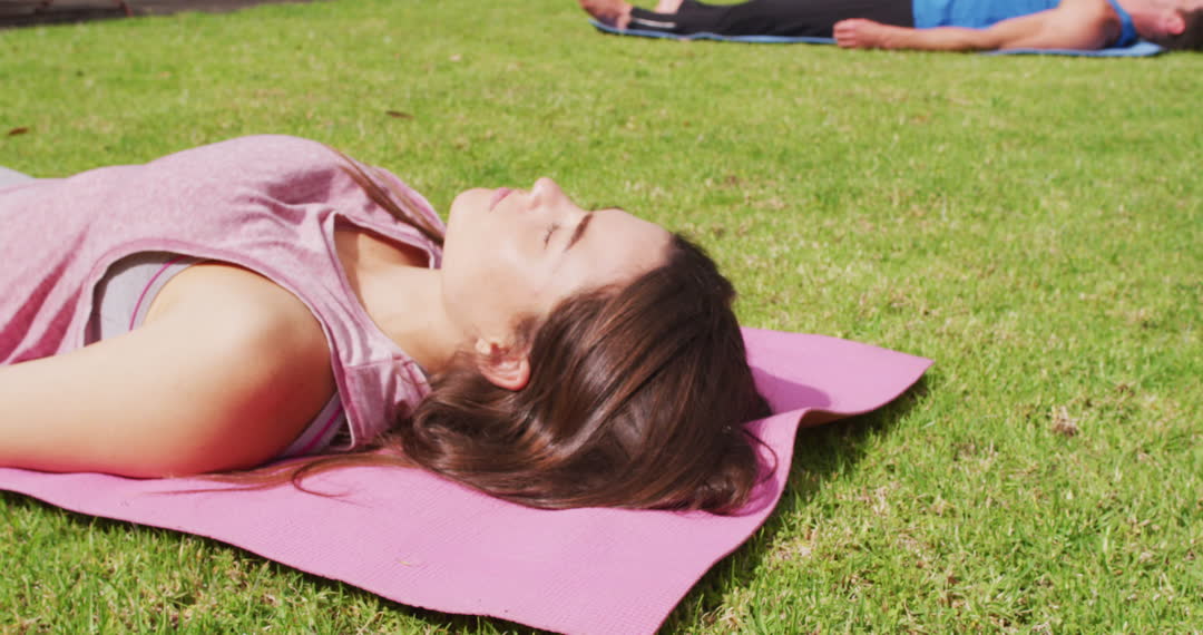 Individuals practicing yoga outdoors lying on mats with eyes closed under the sun, emphasizing well-being and tranquility. Useful for promoting outdoor fitness activities, yoga classes, mindfulness practices, and healthy lifestyle choices.