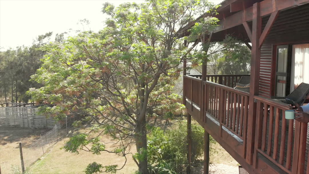 Relaxed Amidst Nature on Veranda of Wooden Log Cabin Video