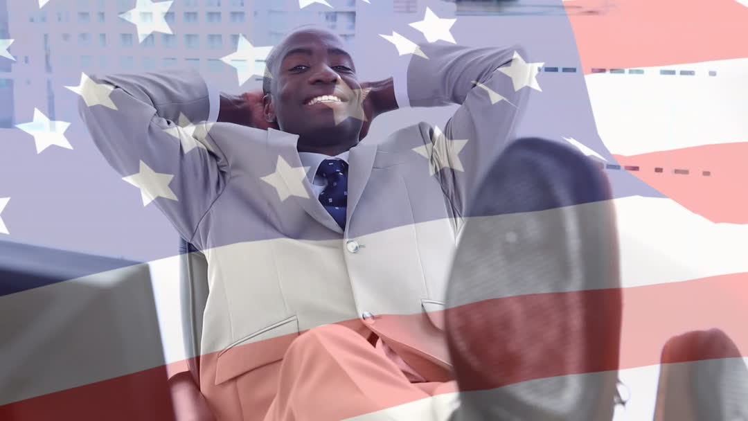 Relaxed Businessman in Office Overlaid with United States Flag Video
