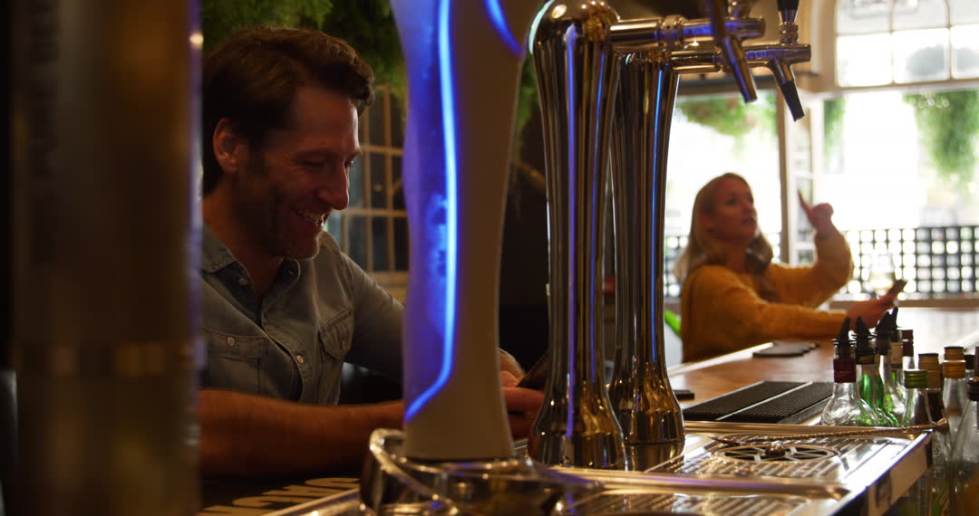 A man and woman are sitting at a bar, appearing relaxed while checking their phones and waiting for drinks. The lighting suggests a cozy summer ambiance. This scene is great for depicting leisure and socializing moments at hotels, illustrating vacation vibes, or for online articles about travel and hospitality strategies.