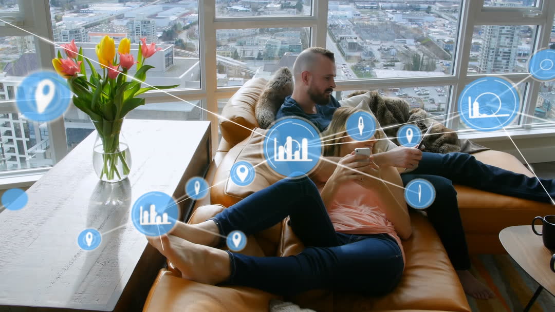 A couple is comfortably lounging in an urban apartment, engaging with digital technology. Overlaid with virtual connectivity icons, it represents smart living and modern technology integration in everyday life. Useful for concepts like smart homes, connectivity, and digital lifestyle.